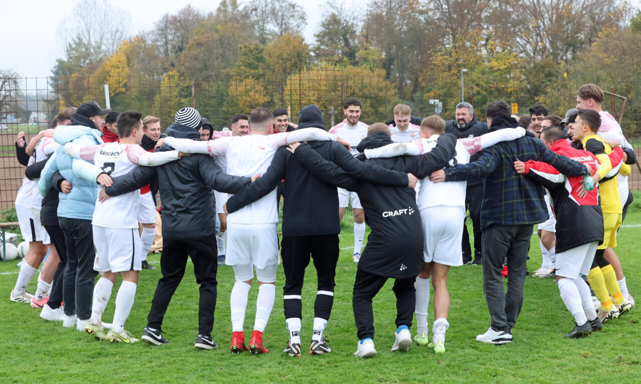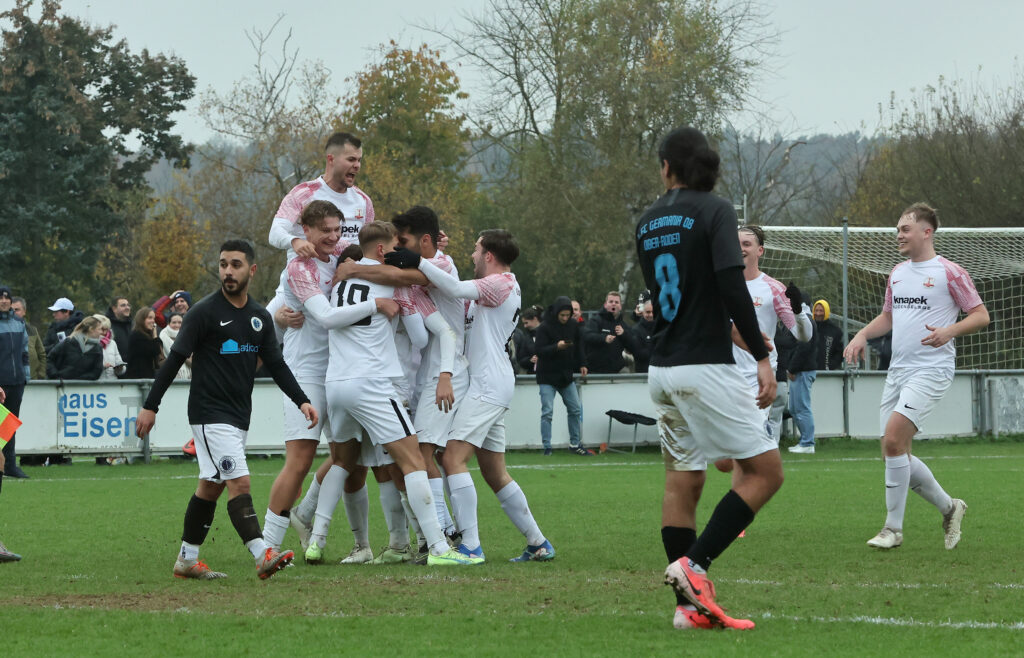 Großer Jubel bei der 2. Mannschaft der Turnerschaft Ober-Roden. Die letzten Minuten waren überstanden, der Derbysieg bei der Germania unter Dach und Fach. Zurecht wurde nach dem Spiel ausgelassen gefeiert und dann die 1A im Derby unterstützt. (Foto: Sascha Eyßen)