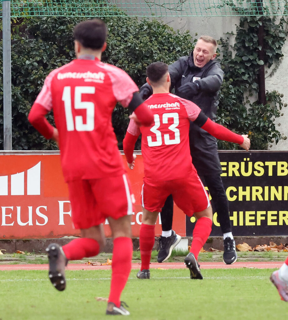 Tolle Bilder, begeisterter Jubel und Erleichterung bei der 1B, die ihren Lauf mit dem Heimsieg fortsetzen konnte. Hier freute sich das Team mit Torschütze Samet Findik nach seinem Treffer zum 3:1. (Foto: Estelle Potoczny)