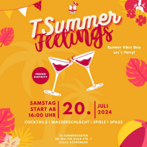 Im Anschluss an das Spiel bei besten Wetter findet findet organisiert von der Vereinsjugend eines unserer Highlights in der SommerGarten Zeit statt. Mit „Summer-Feelings“ lädt der Verein Jung und Alt aufs Sportgelände, um gemeinsam bei Wasser- und Spaß-Spielen, sowie Cocktails, einem DJ etc. eine gute Zeit in diesem Sommer zu verbringen.