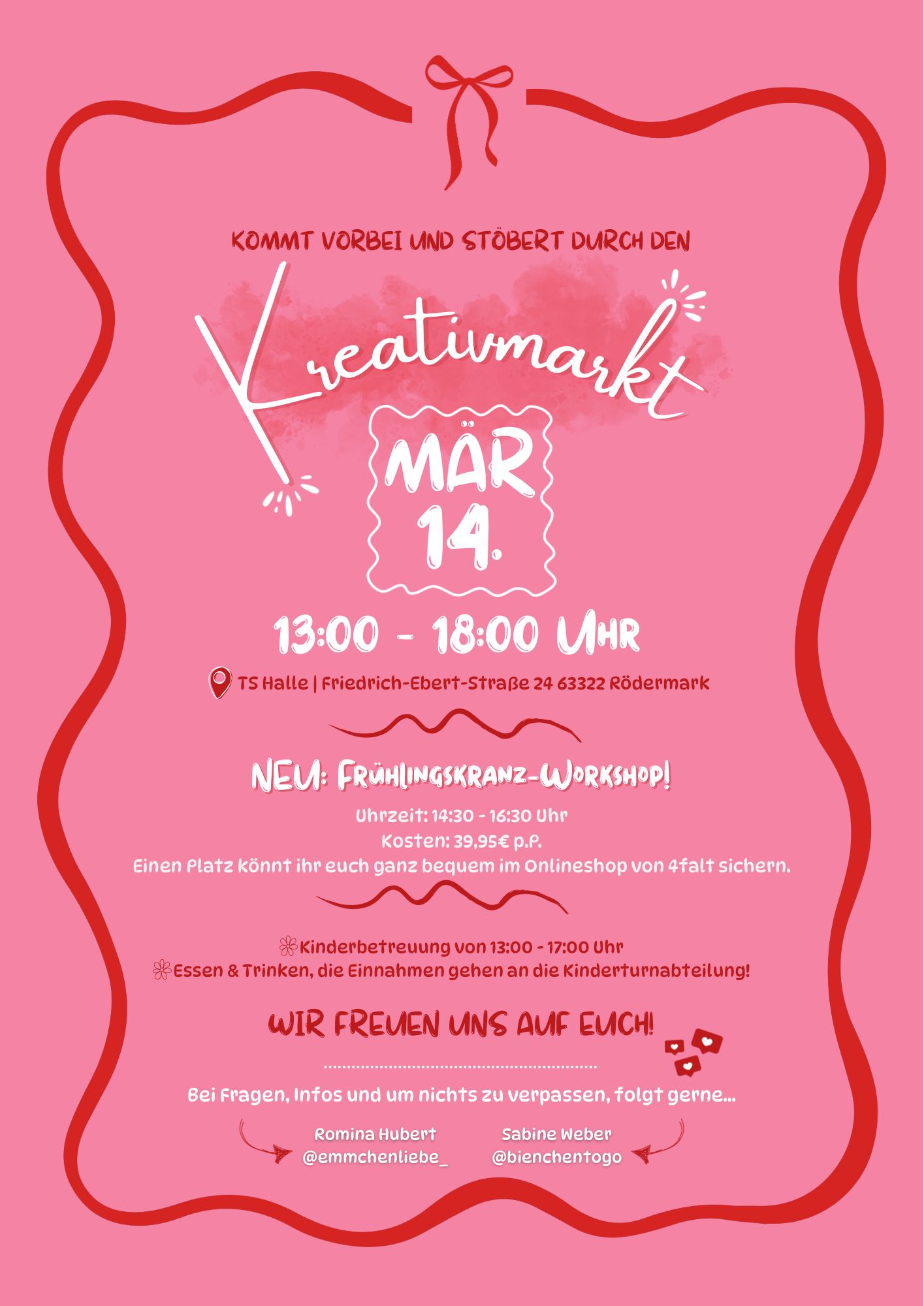Am kommenden Samstag, dem 14.03.2026 findet der nächste Kreativmarkt in der TS-Halle (Friedrich-Ebert-Str. 24) statt. Von 13 – 18 Uhr besteht die Möglichkeit, durch die Stände zu stöbern und die breite Angebotspalette zu nutzen. Von 13 – 17 Uhr findet auch eine Kinderbetreuung statt. Ein Essens- und Getränkeangebot ist ebenfalls da, die Einnahmen gehen an die Kinderturnabteilung. Zusätzlich zu tollen Handmade-Produkten, Kreativem, Schmuck, Kleidung, etc. gibt es dieses Mal einen Frühlingskranz-Workshop (14:30 – 16:30 Uhr für 39,95 € pro Person). Ein Platz hierfür kann im Onlineshop von 4falt gesichert werden. Auch die Möglichkeit für Piercings und Tattoos besteht. Wir freuen uns auf viele Besucher bei der neuesten Aufage des Kreativmarkts.