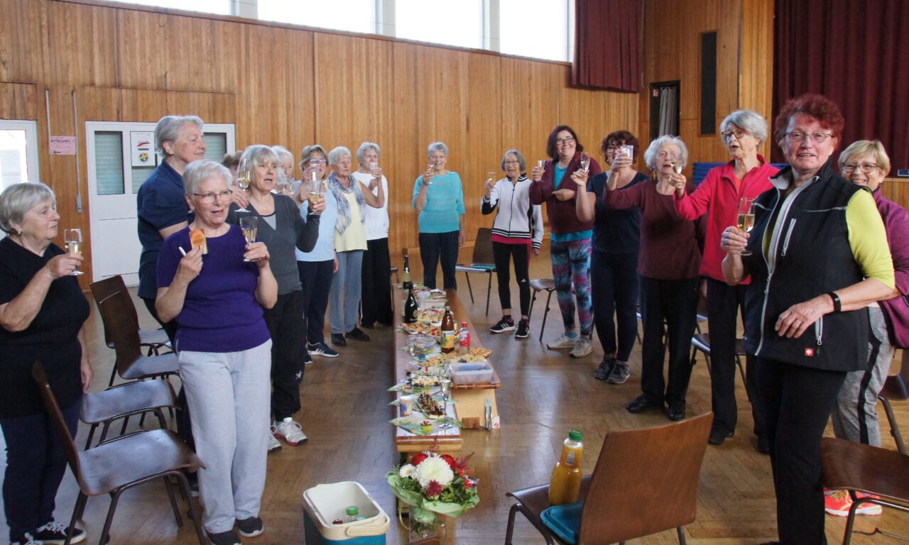 Zum Start der Osterwoche ging in der TS-Turnhalle an der Friedrich-Ebert-Straße eine Ära zu Ende. Monika Müller (im Vordergrund rechts) leitete letztmalig die Montags-Frauen-Gymnastik der Turnerschaft Ober-Roden. Auch wenn einiges an Wehmut in der Luft lag, gab es nach dem sportlichen Tun noch eine gesellige und sichtlich von guter Laune geprägte „Verlängerung“. TS-Vorsitzender Peter Hubert, auch Abteilungsleiter Turnen in Ober-Rodens ältestem Sportverein, verabschiedete seine mit Abstand dienstälteste Mitarbeiterin persönlich: Im Januar 1989 gestartet, ging Monika Müller nach 33 Jahren und 3 Monaten in den Ruhestand. Die Wachablösung erfolgt am kommenden Montag (25.04.) ab 10:15 Uhr im Sportplatz-Gymnastikraum an der Dr.-Walter-Kolb-Straße, wenn Manuela Weber nunmehr für den sportlichen Wochenstart der sportlichen Damen sorgt. (Foto: TSO)