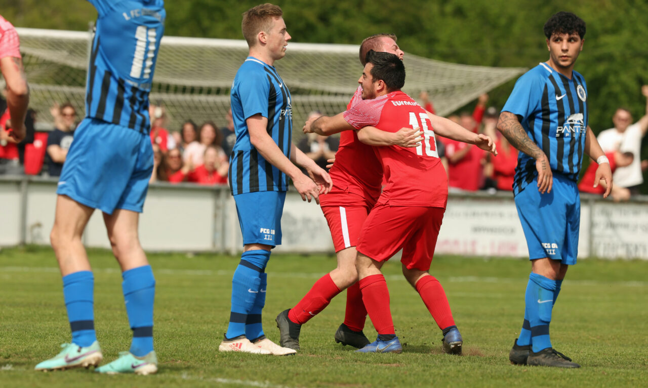Derby Pur! Vor vielen emotionalen Zuschauern war das 5:5 im B-Liga Ortsderby zwischen den 3. Mannschaften von Germania und Turnerschaft ein echtes Spektakel. Hier jubelt Joel Fernandez Martinez (rechts) mit Alex Schmidt über sein Weitschusstor zum 1:1. Im Hintergrund die vielen lautstark jubelnden TS-Anhänger. (Foto: Sascha Eyßen)