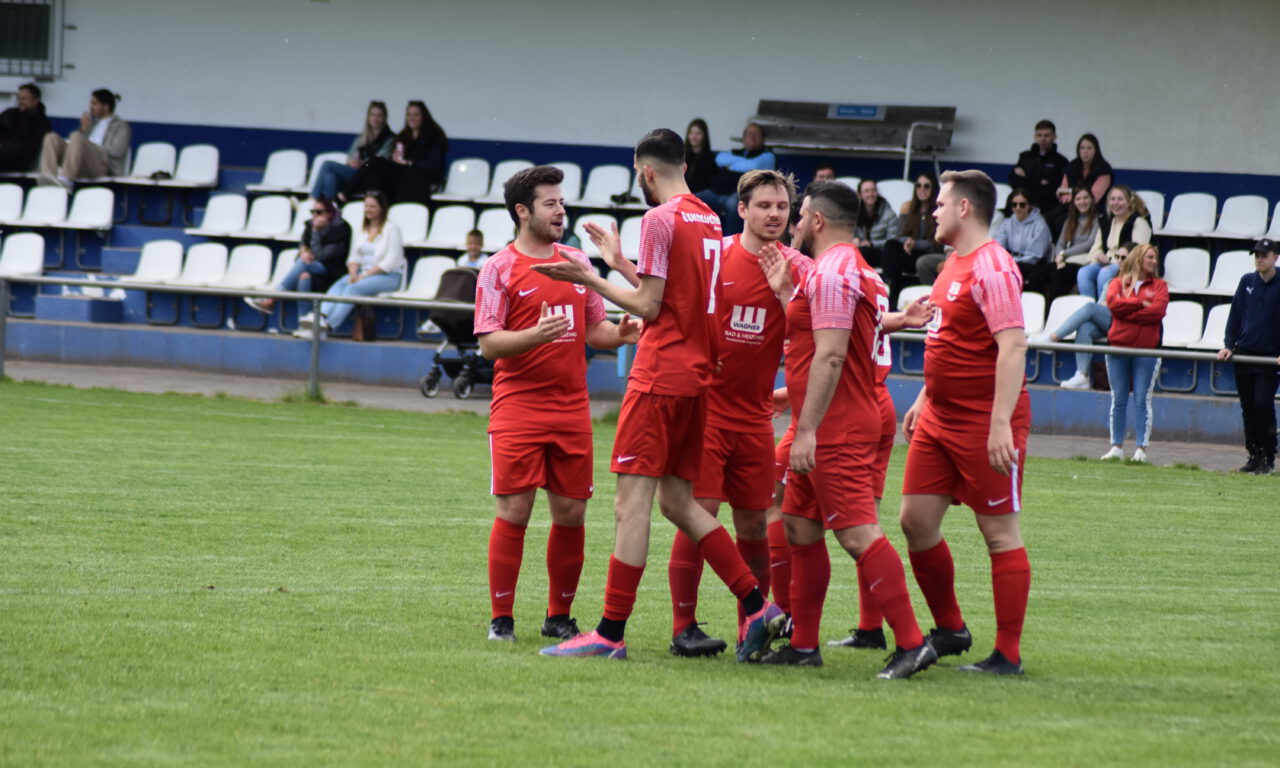 Torjubel bei unserer 3. Mannschaft im Derby. Aufgrund der neuen Trikots endlich wieder in Rot freut sich die Mannschaft von Dennis Prüstel hier über das 2:0. Leider konnten die drei Punkte nicht über die Zeit gebracht werden. (Foto: Martin Scharf)