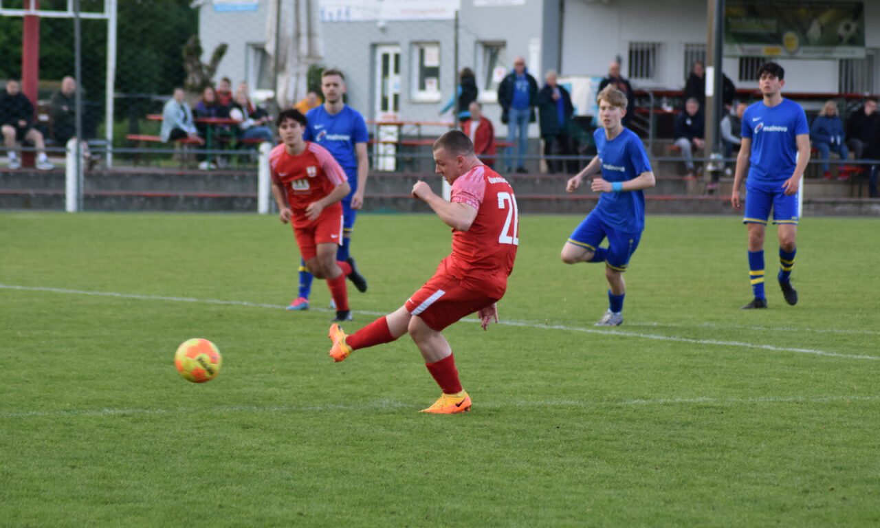 Sebastian Müller trifft vom Punkt zum zwischenzeitlich 3:0 gegen Langstadt/Babenhausen II. Am Ende schoss sein Team, das den Klassenerhalt in der B-Liga sicher hat, einen 6:2 Heimsieg heraus. (Foto: Martin Scharf)