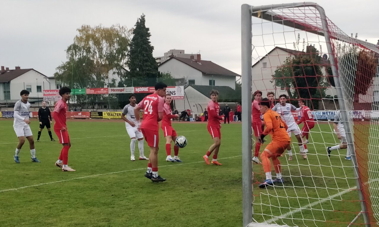 Spannende Torraumszenen zuhauf gab es in einem hochklassigen Spiel der U19 Hessenliga zwischen der TS und Bayern Alzenau. Am Ende stand ein hochverdienter 1:0 Erfolg des Heimteams. (Foto: N. Eyßen)